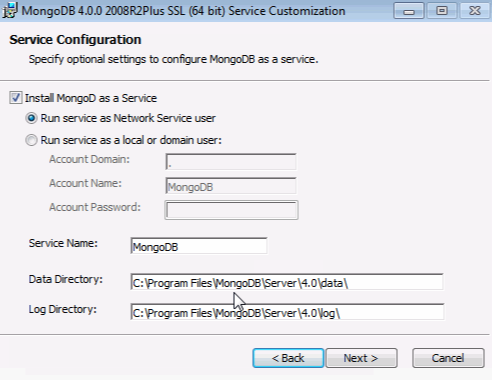 MongoDB 4.x 버전 기준 msi 설치 시는 아래와 같이 service를 설치를 할 수있습니다.
