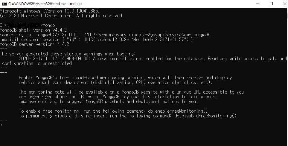 다른 cmd창을 키고 mongo 명령어 입력